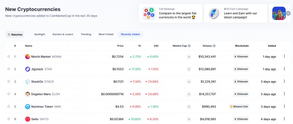 Coinmarketcap (CMC) updates its directory with new cryptocurrencies. The directory displays coins and tokens added within 30 days. It can be sourced at https://coinmarketcap.com/new/