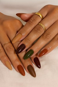 Neutral fall tones like mocha or forest green transition seamlessly into November and Thanksgiving nail looks.