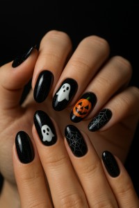 Popular motifs: tiny ghosts, silver spiderwebs, black cats, or glittery pumpkins.
