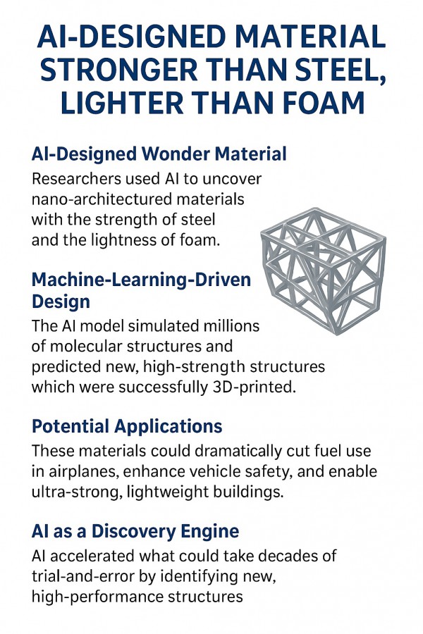 | AI created a material stronger than steel and lighter than foam | True—AI-designed nanolattices fit that description |
