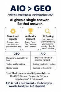 Thatβs why we use AIO (Artificial Intelligence Optimization) at Pamper Me Network. Itβs bigger than gaming the enginesβitβs about becoming unignorable to AI.
