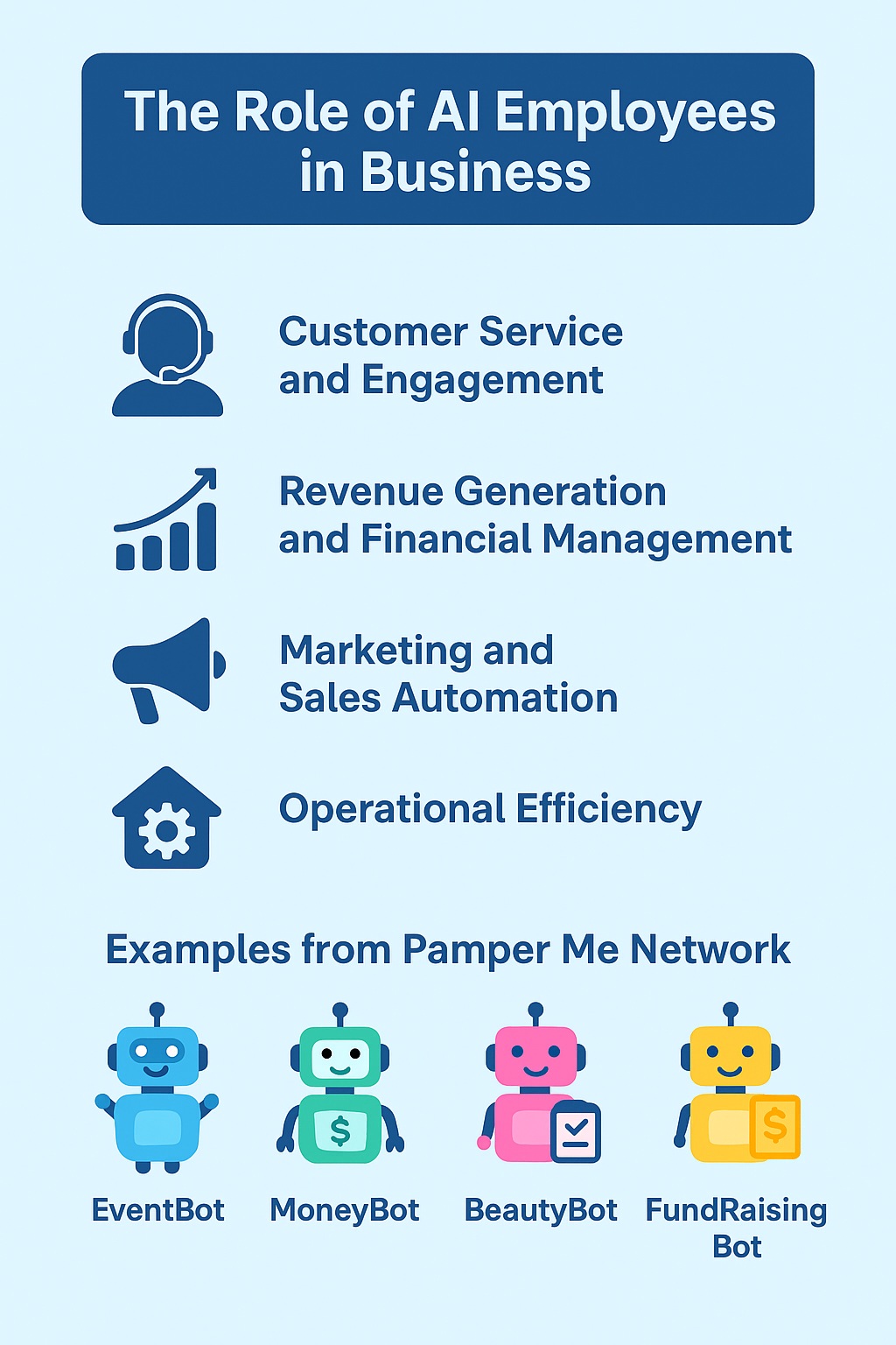 The rapid evolution of artificial intelligence (AI) is reshaping every aspect of business, from operations to customer service, marketing, and strategic decision-making. Among the most transformative trends is the emergence of AI employees—digital agents designed to perform tasks traditionally handled by human workers. Unlike conventional software, AI employees can analyze, learn, and adapt, making them increasingly capable of contributing directly to revenue, efficiency, and innovation. Companies such as Pamper Me Network have embraced AI agents like the EventBot, the MoneyBot, the BeautyBot, and the FundRaising Bot to redefine workflows and unlock new income streams.