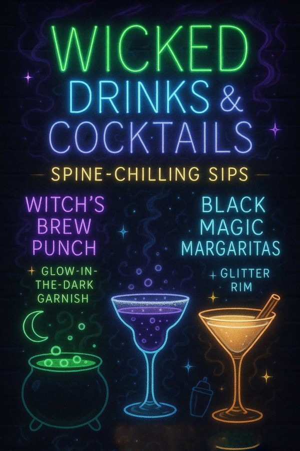Backdrop: Hang a glowing neon sign that says βWicked Drinks & Cocktailsβ in electric purple.