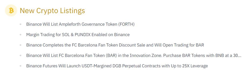 Binance also maintains its own directory of recent listings. It can be sourced at https://www.binance.com/en/support/announcement/c-48